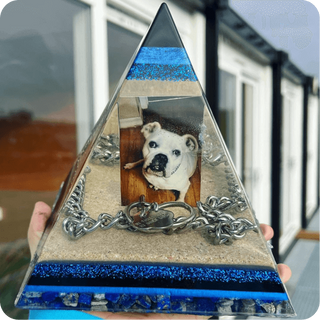 знизу піраміда відливається основним шаром, а саме прахом. далі йде частина інсталяції, де ви можете помістити, наприклад: нашийник, улюблену іграшку, особистий жетон хвостатого та фотографію. варіанти можуть бути різними та залежать від вашого задуму